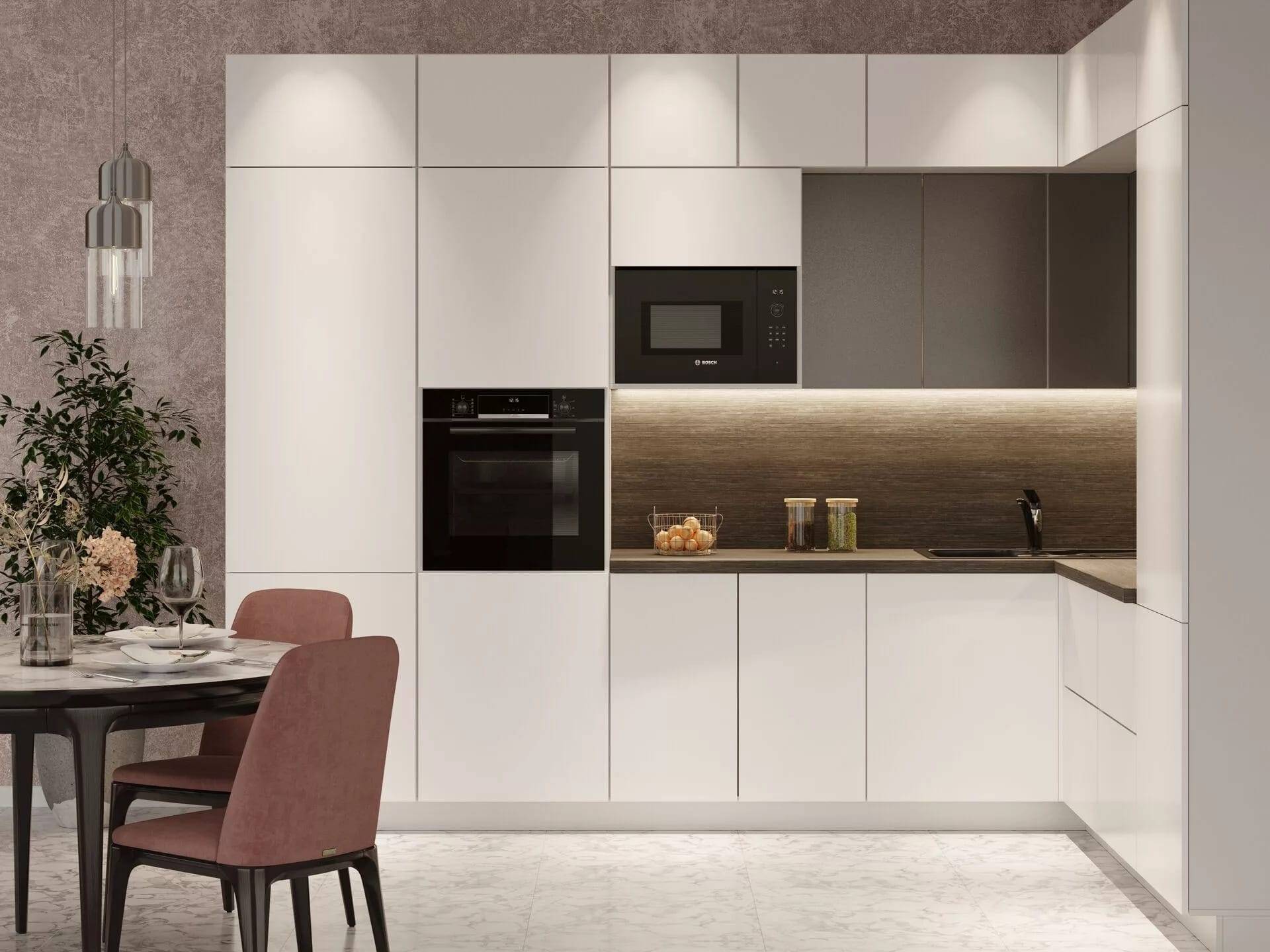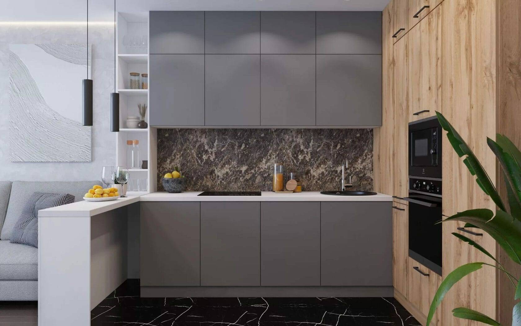 В данном проекте использованы фасадные материалы, категории эко-шпон, фирмы Egger. Они отличаются интересными цветовыми решениями, высоким качеством и устойчивостью к механическим повреждениям и износу. Данный кухонный гарнитур выполнен в теплой цветовой гамме. Контрастная столешница и стеновая панель добавляют законченный вид всей кухне и выгодно оттеняют красоту древесной текстуры.